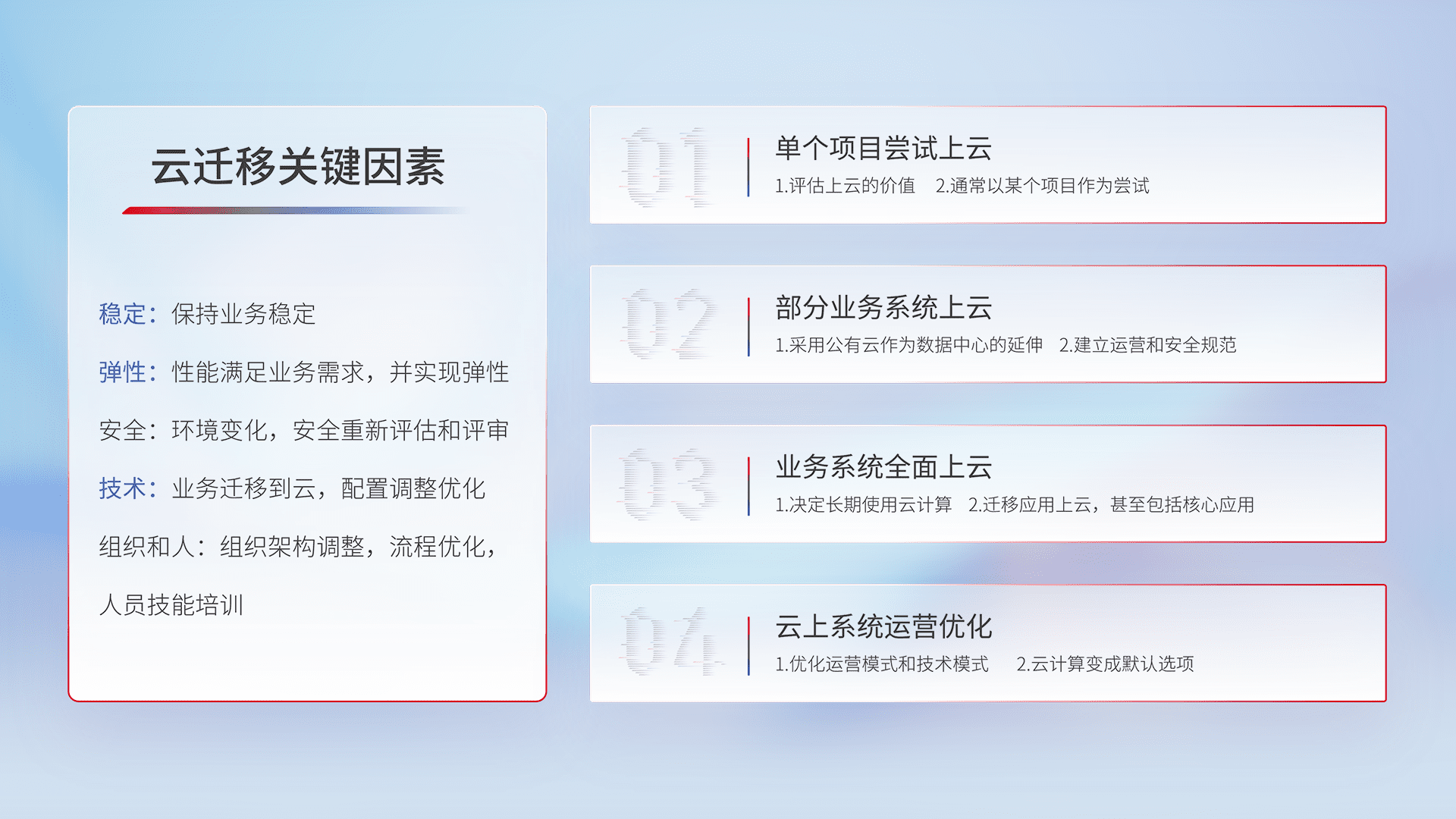 结合实际业务,,从规划设计、、云平台选型、、云原生改造、、数据迁移、、、集成交付,,,迁移全过程为客户识别最佳上云路径,,,做好风险识别管理,,,,设计网络架构、、、身份权限、、、、安全审计合规、、操作审计、、日志审计、、监控告警策略、、多站点容灾设计等,,,,对云上基础设施进行整体规划,,提升IT治理水平,,,,以满足弹性、、、高可用、、、、高性能的需求。。