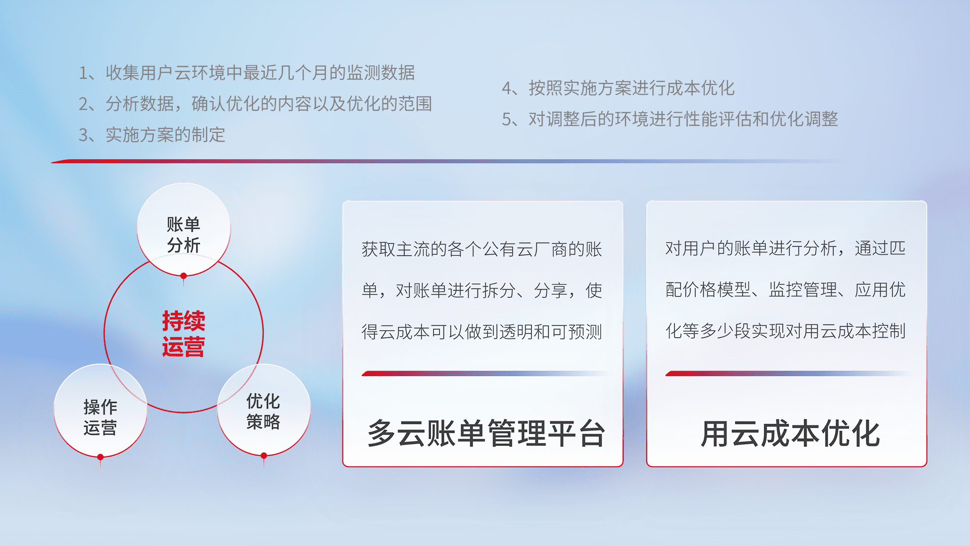 通过多云纳管,,,以统一的资源数据模型把客户的云资源进行抽象和封装,,,,进而实现对多云资源的统一操作,,保障云资源管理的可靠性、、、、稳定性与可用性。。。。量身定制化运维内容,,,配置、、、、开发运维、、、、补丁管理、、备份、、监控、、认证和访问管理、、、审计和日常巡检等,,保障在用云过程中的可靠度,,,,稳定度以及高可用率。。